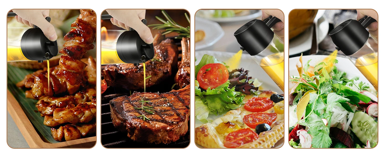 DISPENSADOR DE ÓLEO E SPRAYADOR DE ÓLEO 2 EM 1: O dispensador de óleo 2 em 1 para cozinha oferece recursos de vazamento e pulverização. O pulverizador de óleo libera 0,15 g de óleo uniformemente na forma de um 60° spray, a saída de óleo de vazamento de 0,4 polegadas do dispensador de óleo para cozinha pode despejar com precisão e limpeza a quantidade necessária de óleo, manter a cozinha limpa e reduzir o desperdício de óleo