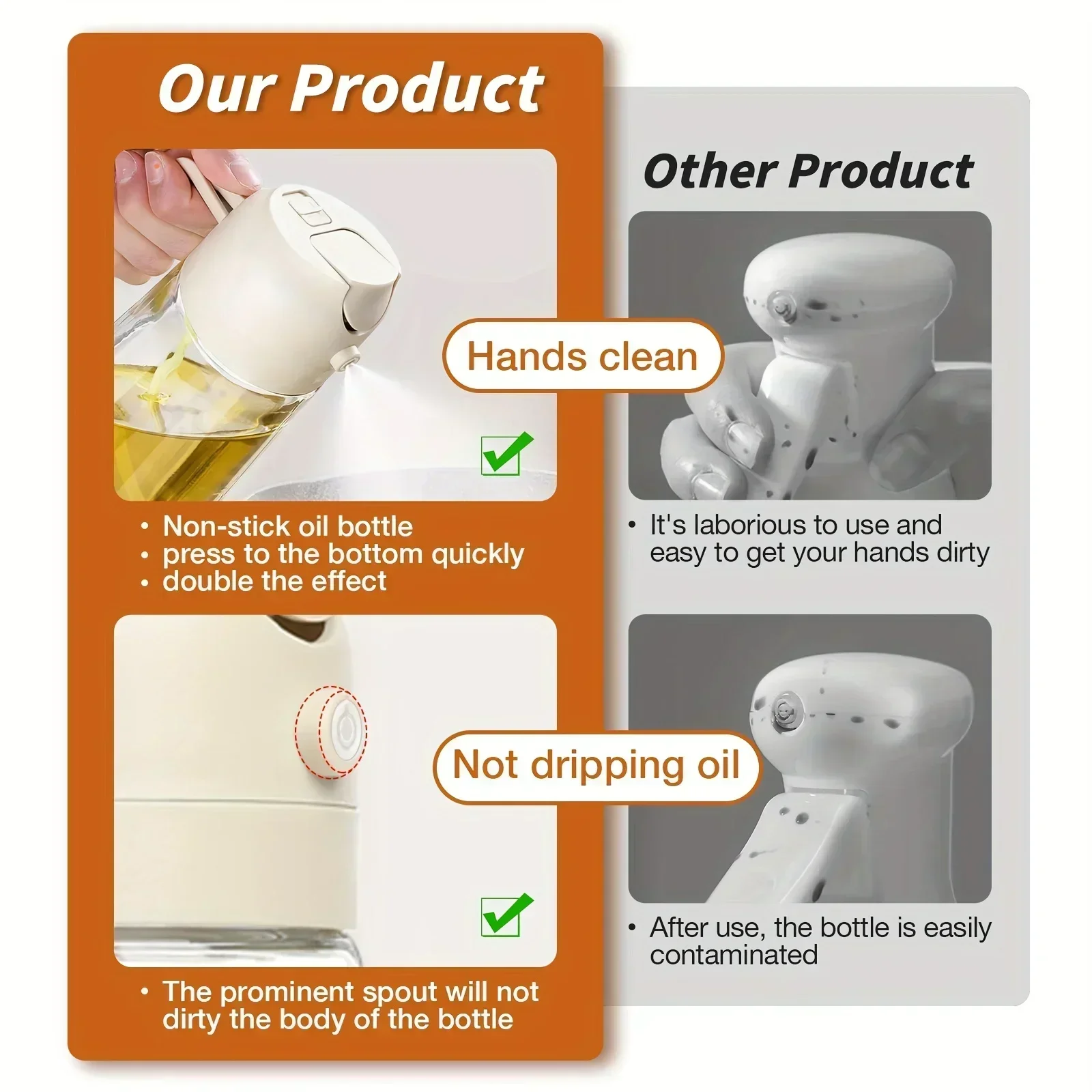 GARRAFA DE SPRAY DE ÓLEO OLIVA MULTIUSOS: o frasco de spray de azeite adota uma alça ergonômica, que é muito confortável de segurar.A haste de prensagem longa e larga pode dispensar óleo facilmente.Este frasco spray de azeite pode adicionar uma variedade de condimentos, como azeite, suco de limão, vinho tinto, molho de soja, etc., o que é muito adequado para temperar, grelhar, preparar saladas, assar ou cozinhar