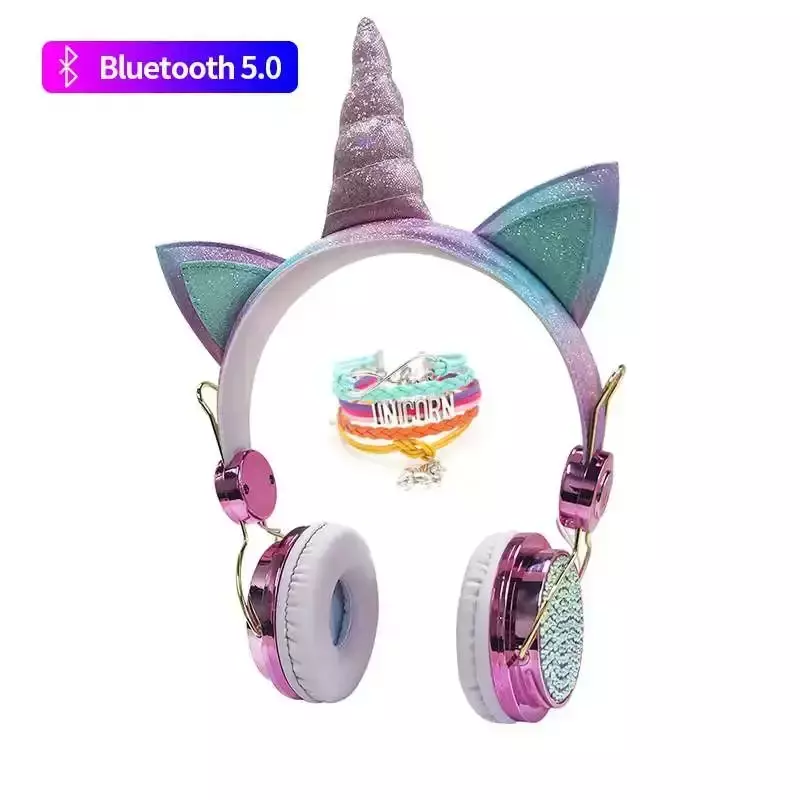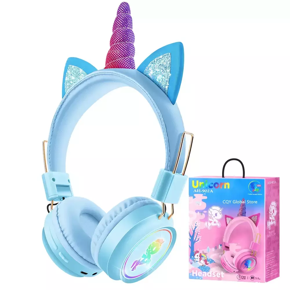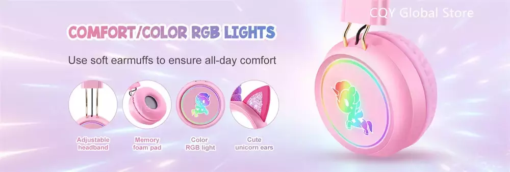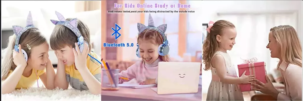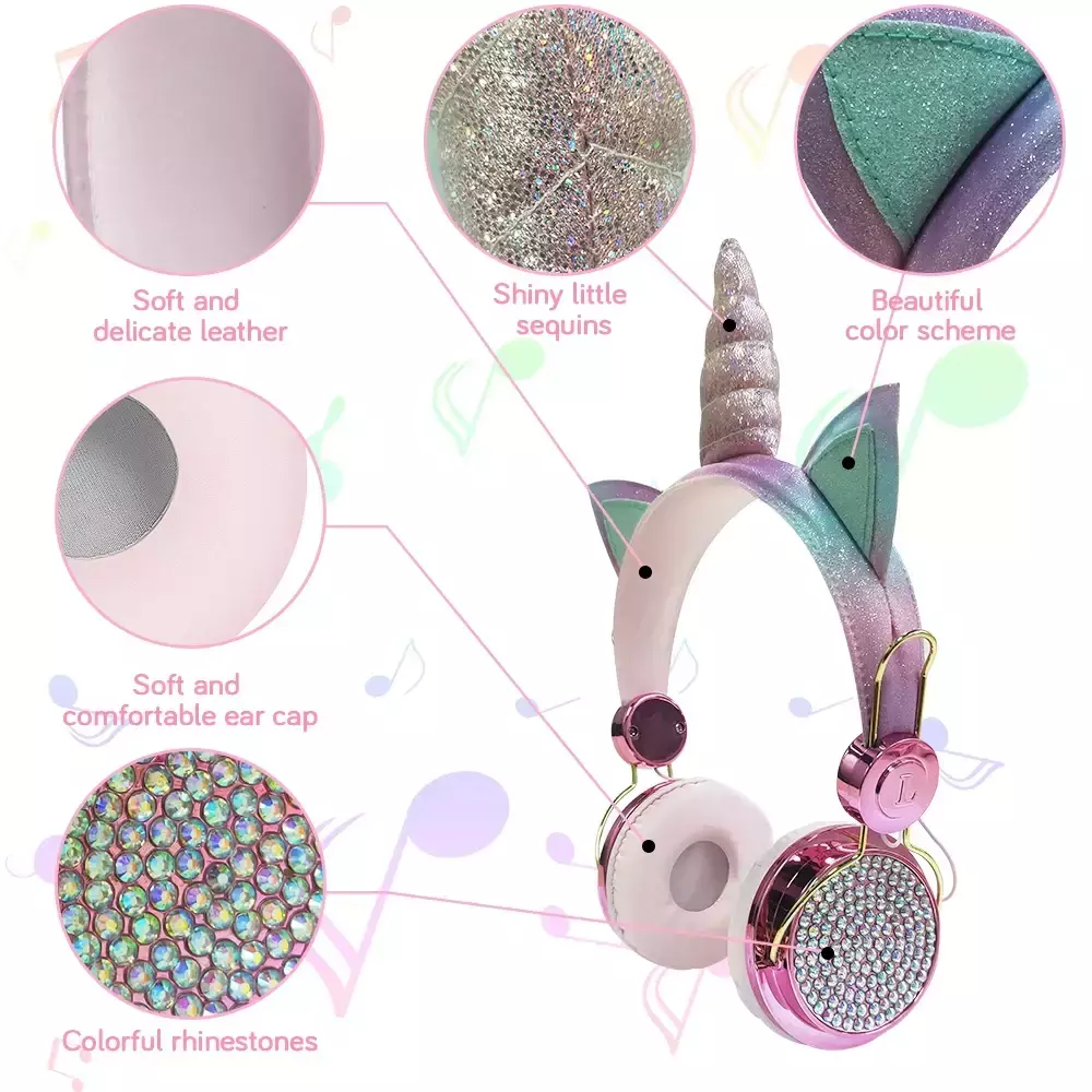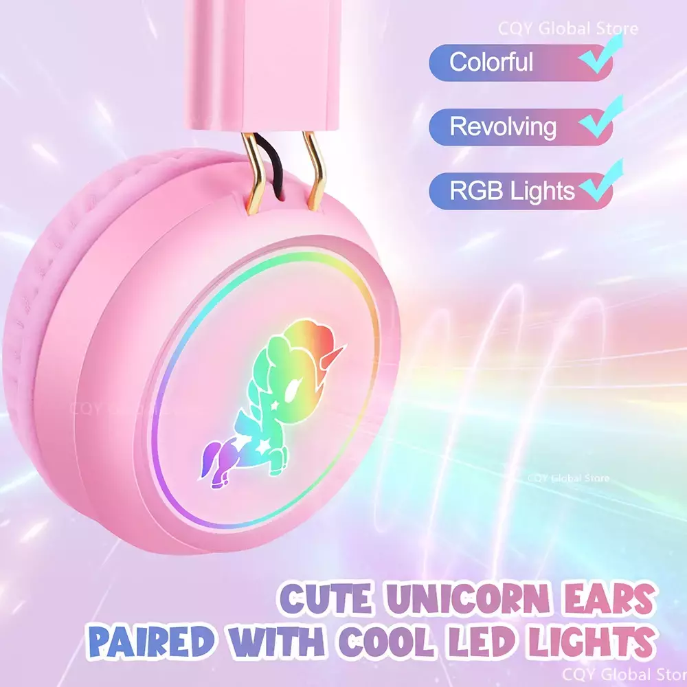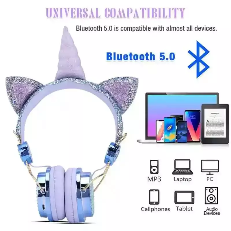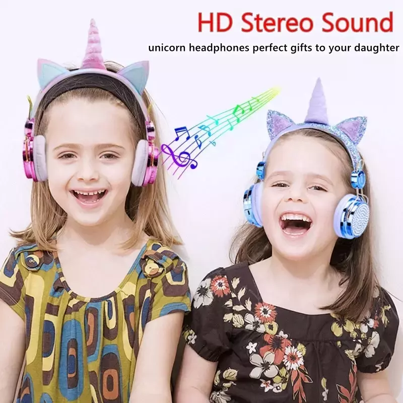 Este design de unicórnio brilhante fofo e moderno, as crianças vão adorar este fone de ouvido Bluetooth, as luzes coloridas em ambos os lados do fone de ouvido piscarão e a cor mudará automaticamente durante o trabalho.Além disso, o pacote vem com 4 adesivos DIY, para que seu filho possa decorar os fones de ouvido de acordo com suas preferências.