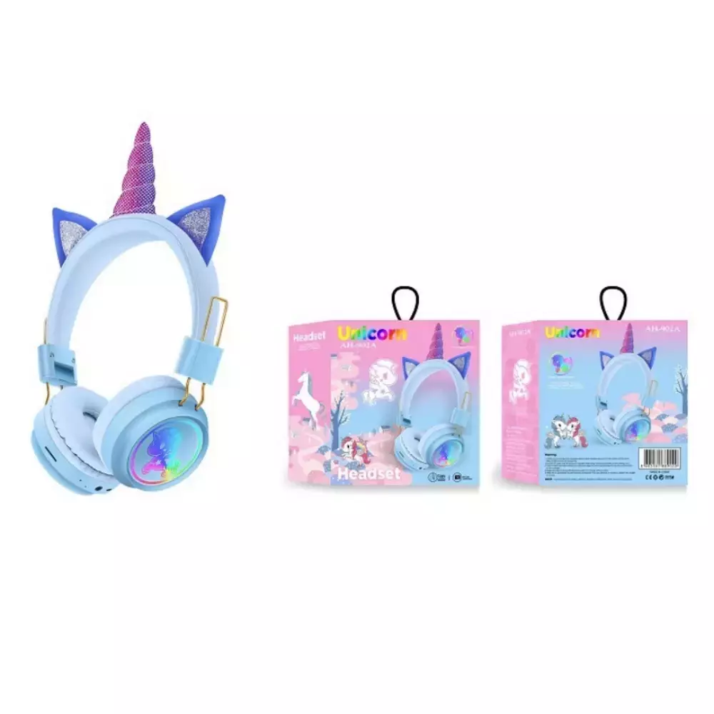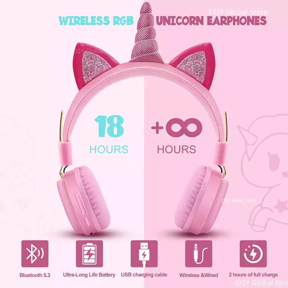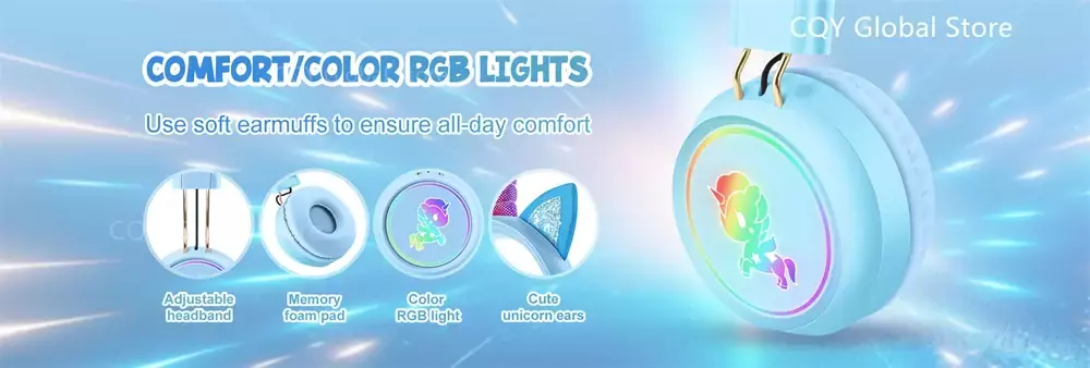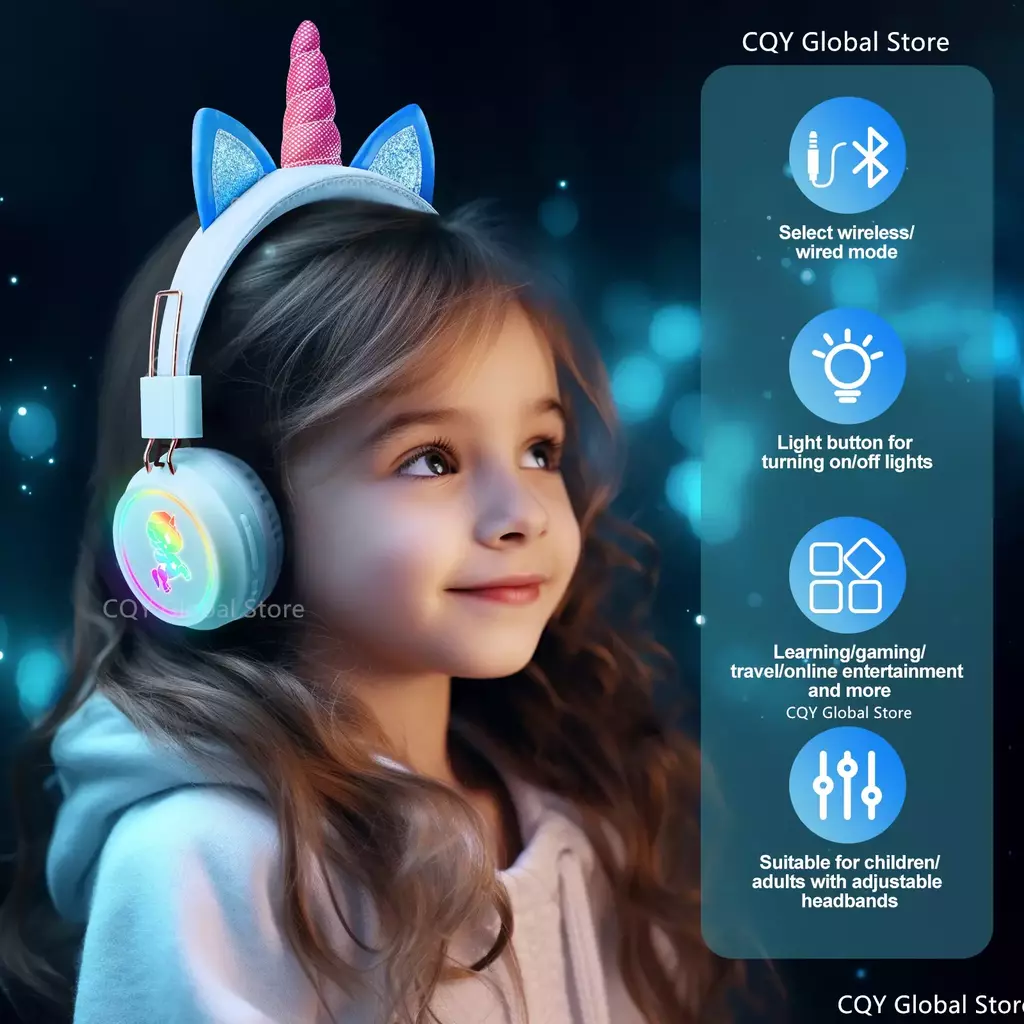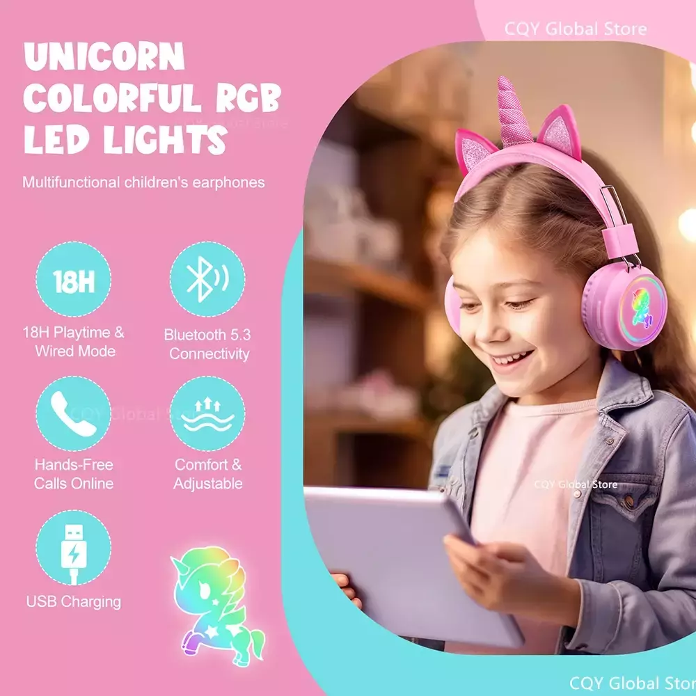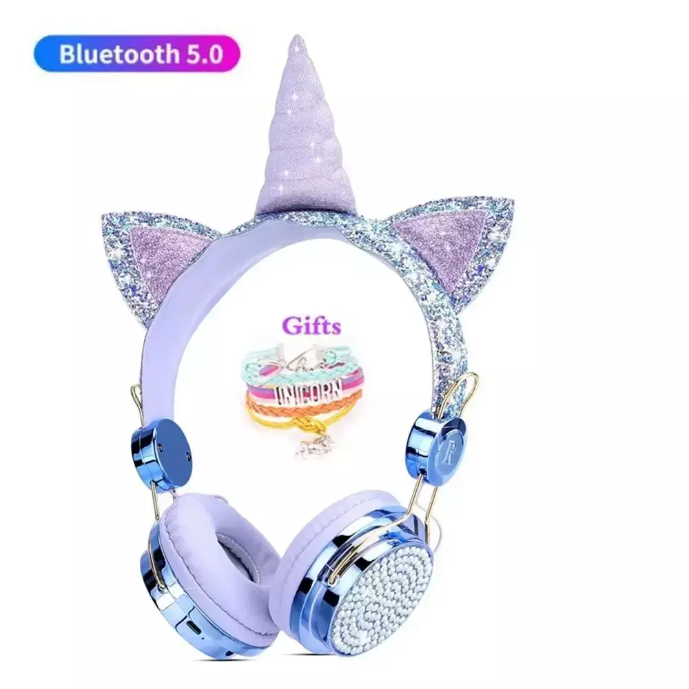 Este design de unicórnio brilhante fofo e moderno, as crianças vão adorar este fone de ouvido Bluetooth, as luzes coloridas em ambos os lados do fone de ouvido piscarão e a cor mudará automaticamente durante o trabalho.Além disso, o pacote vem com 4 adesivos DIY, para que seu filho possa decorar os fones de ouvido de acordo com suas preferências.