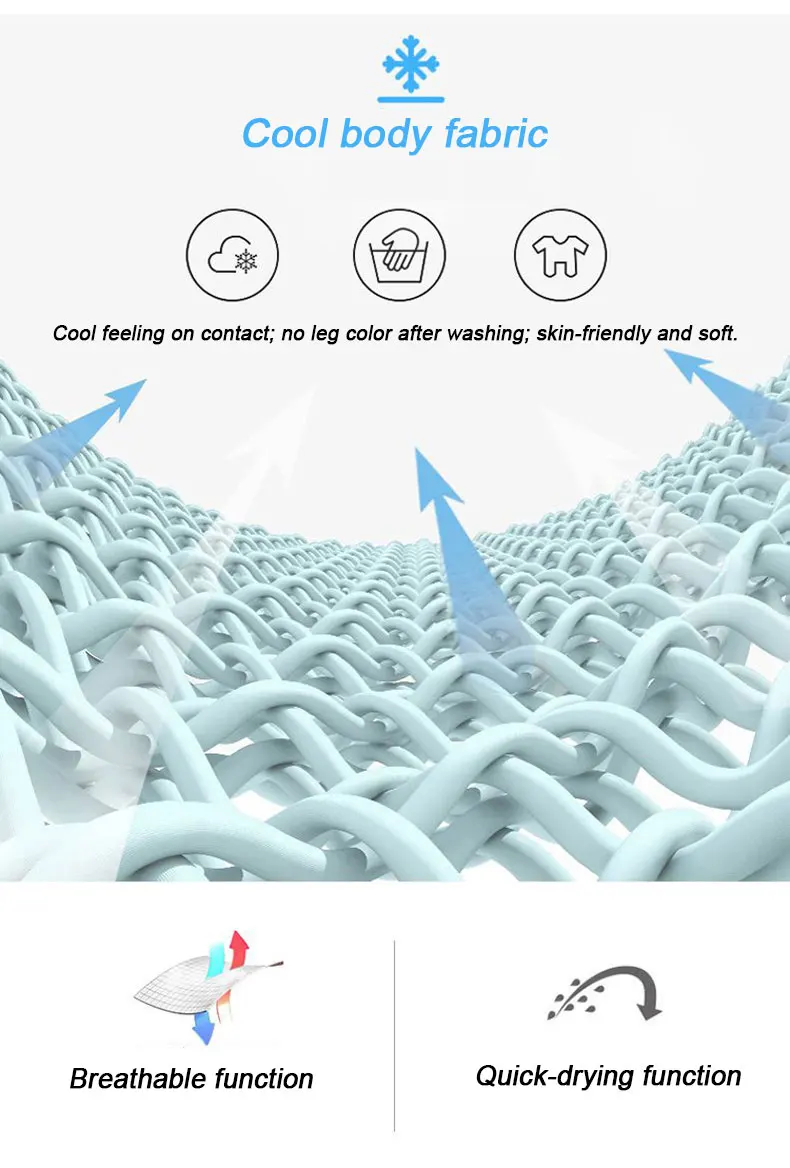 Sensação fresca de contato; sem cor das pernas após a lavagem; agradável à pele e macio.